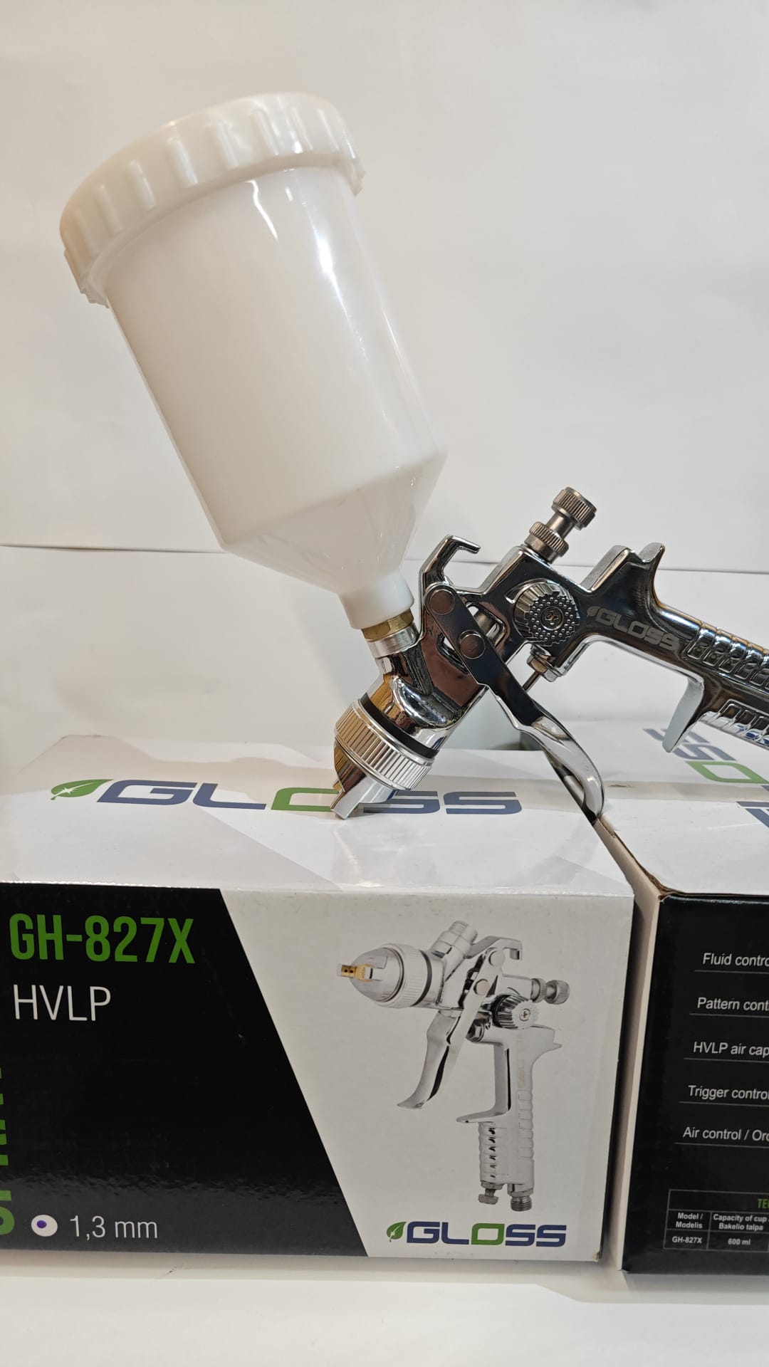 Pistol de vopsit Gloss GH-827X HVLP, cupa plastic 600 ml, duza 1.3, consum aer incepand cu 71 l/min Gloss Specificatii tehnice Gloss GH-827X Presiune – 2.5 – 3.5 bar Consum AER – 71 – 99 l/min ( cfm) Greutate pistol + cana– 545 grame Capacitate CUPA – 600 ml Culoare: Albastru sau Cromat Pachetul contine: pistol, cana, cheie, perie, filtru cupa Acest pistol se poate comanda cu duza de: 1.3mm